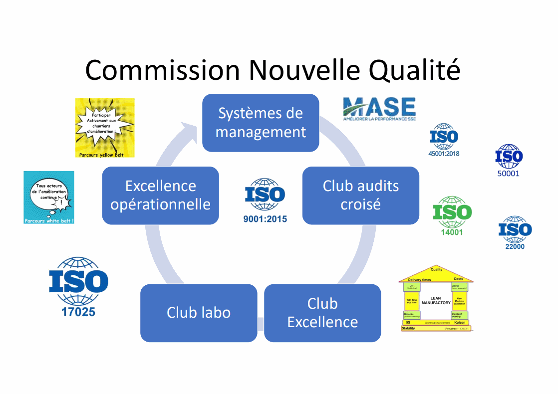La commission Nouvelle Qualité regroupe les thèmes suivants : normes ISO 9001-14001-45001, MASE, 9100, 13485, 50001, 17025, 22000, …. le LEAN (management, manufacturing), l’excellence opérationnelle... les audits … que ce soit pour des formations, des clubs de partage de bonnes pratiques, des ateliers, des accompagnements.